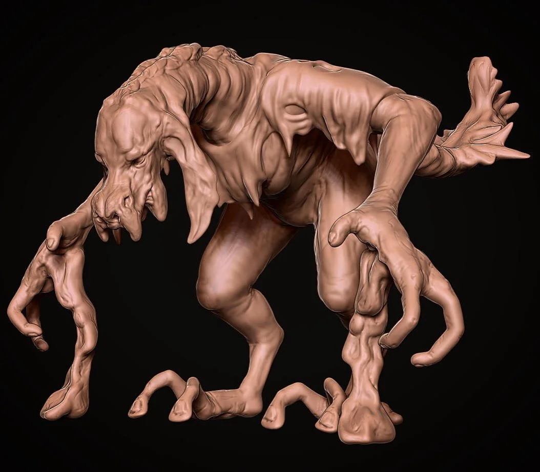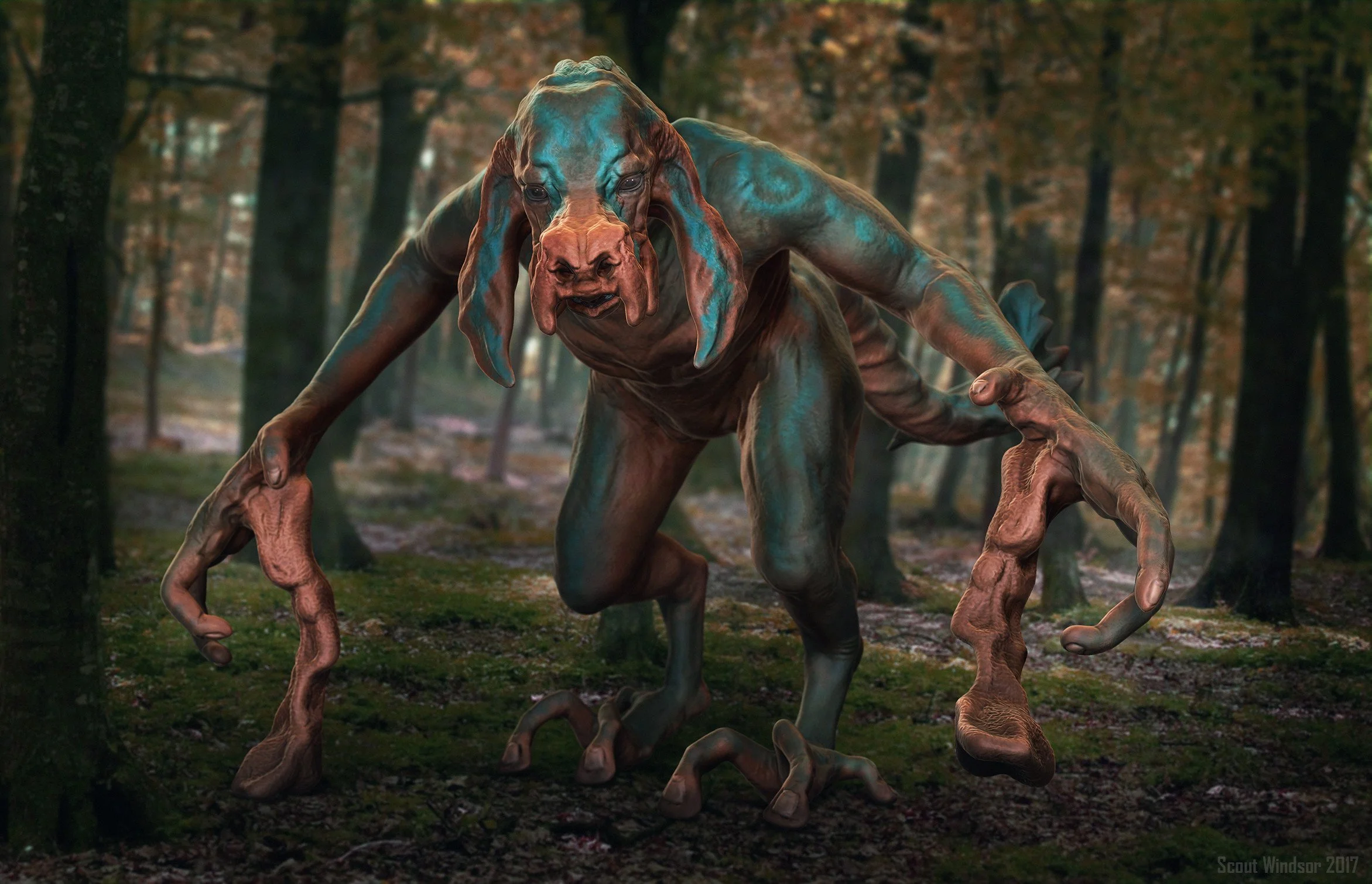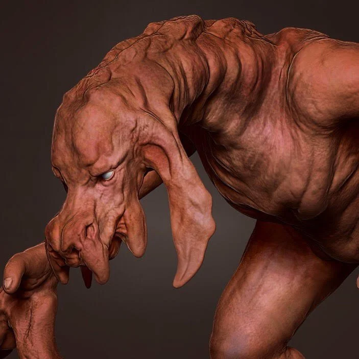 Towering over their human companions, Curradantu are gentle and slow moving creatures. This particular skin colouration is common among the forest dwelling subspecies of the northern islands. Sculpted in ZBrush, rendered with ZBrush + Photoshop.